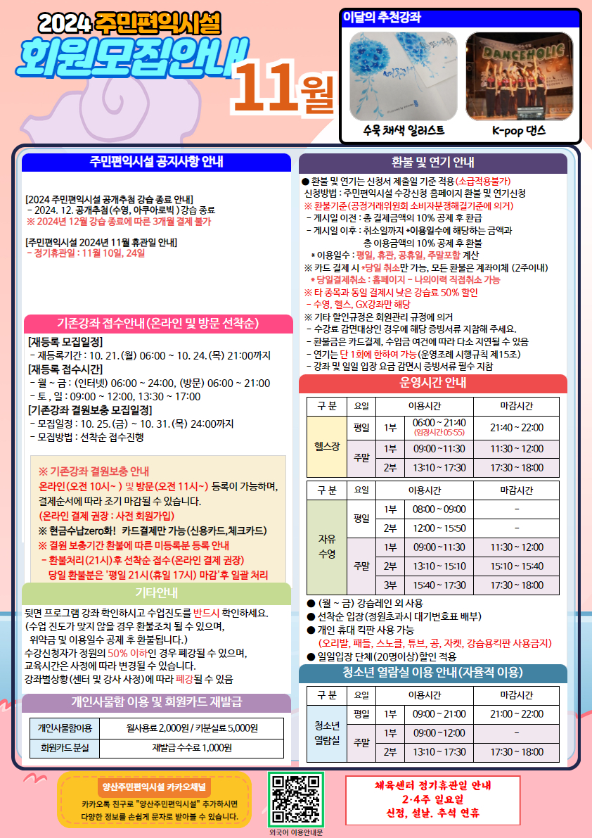 | 구분 | 수영장 | 헬스장 | 청소년열람실 | 어린이열람실 | U- 영어놀이터 |