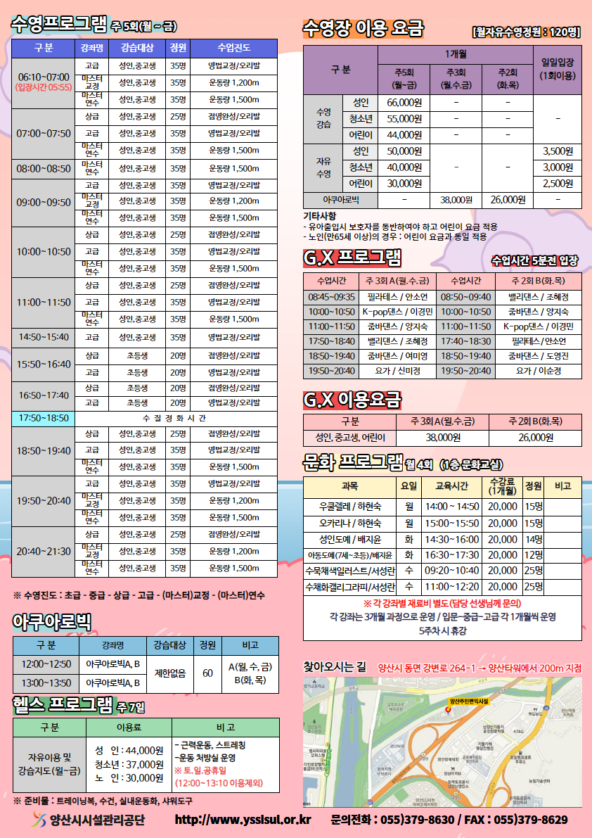 · 각 이용요금은 양산시 거주자에 한하고, 양산시에 주민등록을 두지 않은 이용자에 대해서는 이용료의 20%를 가산합니다.